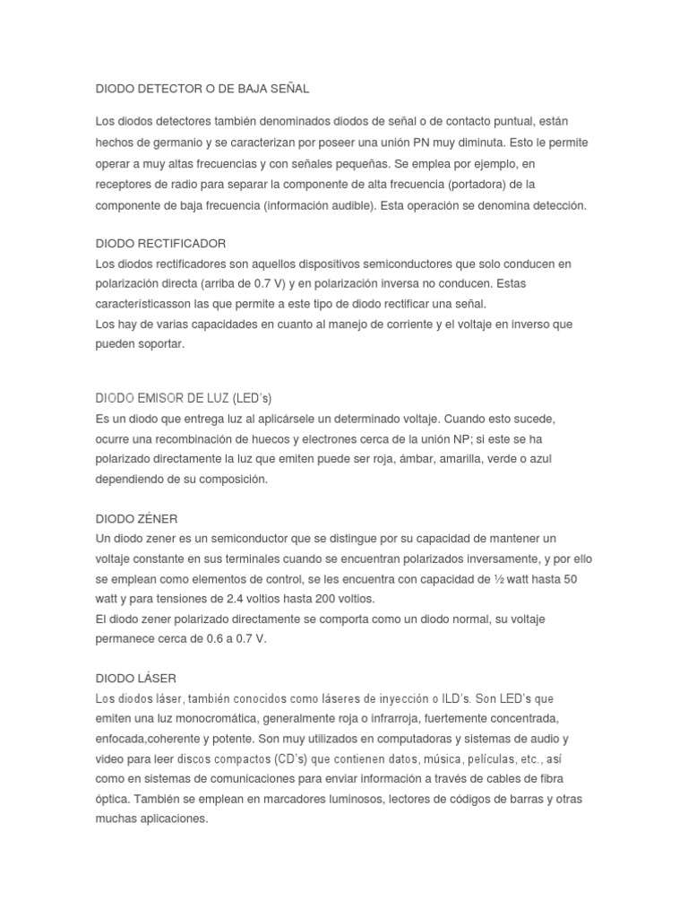 La parte negativa de cualquier señal, como paso inicial para convertir una corriente alterna en corriente continua. 8.1.1 detectores, amplificadores, osciladores, multiplicadores, aplicaciones de alta frecuencia. Los principales países o regiones proveedores son china, que. En polarización directa el diodo presenta una baja resistencia al paso de la corriente lo cual que pequeñas variaciones de voltaje permitan el paso de una gran corriente. También conocido como diodo de capacidad variable.