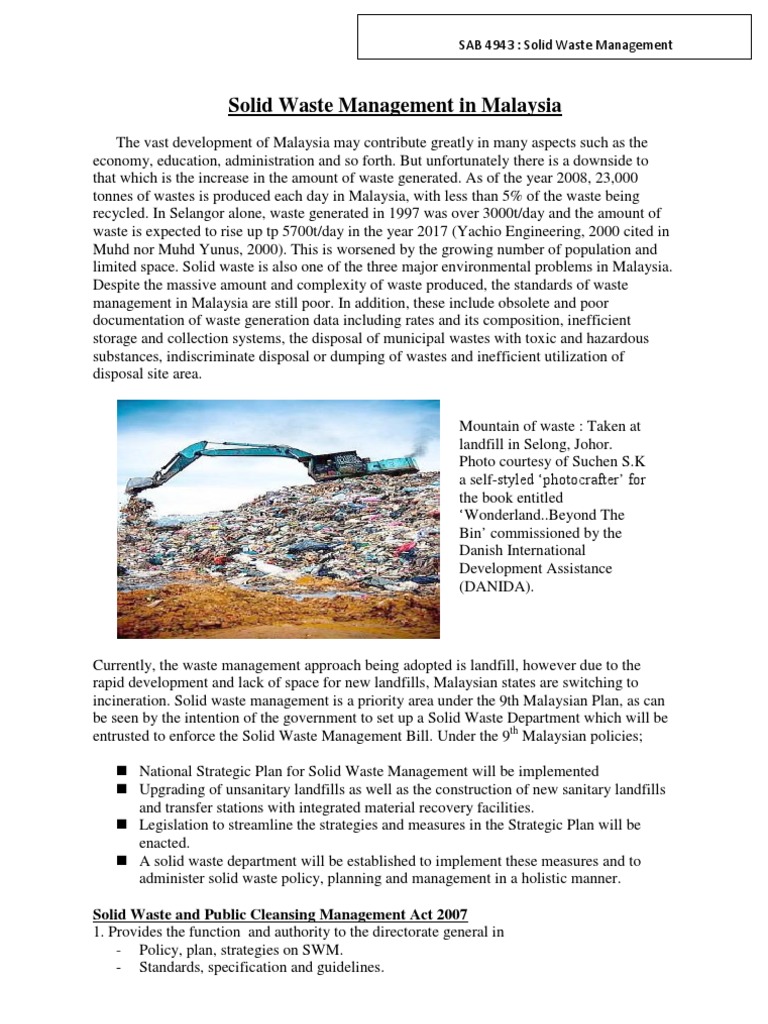 Because they consume and generate more solid. A waste audit is a formal process which. Solid waste management is a priority area under the 9th malaysian plan, as can be seen by the intention of the government to set up a solid waste department which will be entrusted to enforce the solid waste management bill. Hence managing solid waste in malaysia is still a big challenge. Flooding is one of the natural disasters that are becoming more common in malaysia ever.