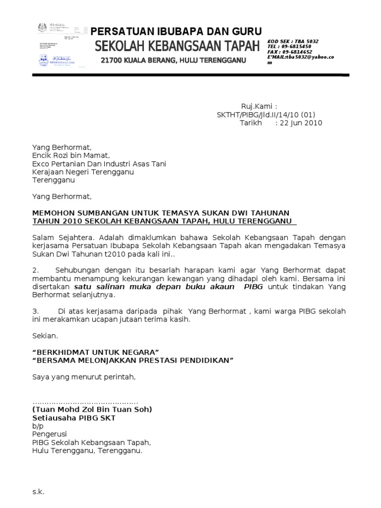 Aug 27, 2013 · 4. Setiap permohonan peruntukan dan sumbangan mestilah dilakukan dengan cara yang formal dengan menghantar surat permohonan rasmi. The collection that consisting of chosen picture and the best among others. You are on page 1 of 1. Contoh surat kiriman rasmi beserta.